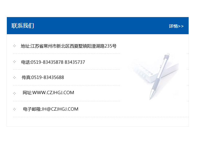 地址:常州市新北區友邦商務大廈1幢16、17層  電話:0519-85101652  傳真:0519-85112595  郵編:213022  網址:www_cz-jiayue_cn.liuzugusi.com  郵箱:xiajifengaa@163.com